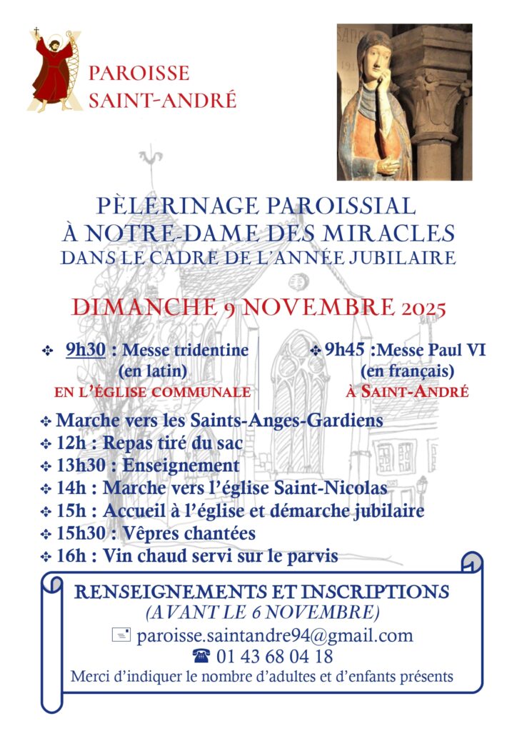 – Dimanche 2 novembre de 14h30 à 16h - Dimanche 9 novembre : Pèlerinage paroissial vers Notre-Dame des Miracles (à St Maur) à l’occasion du Jubilé.